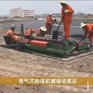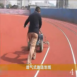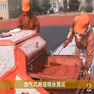 特点:由塑胶黏合废旧橡胶黑颗粒为底层,面层用聚氨酯颗粒与塑胶浆掺混喷涂。透气型塑胶跑道一般主跑道13mm,颜色为红色,辅助区厚度9mm,颜色为绿色。透气型塑胶跑道除具有其它形式的优点外还具有渗水、透气性,也能全天候使用,它是最经济、价格最低廉,而且不会有鼓泡现象发生,同时也减少了地基经费的投入,它适用于建造非正规的中小学田径场地铺设。透气型塑胶跑道使用年限可达到6年以上。